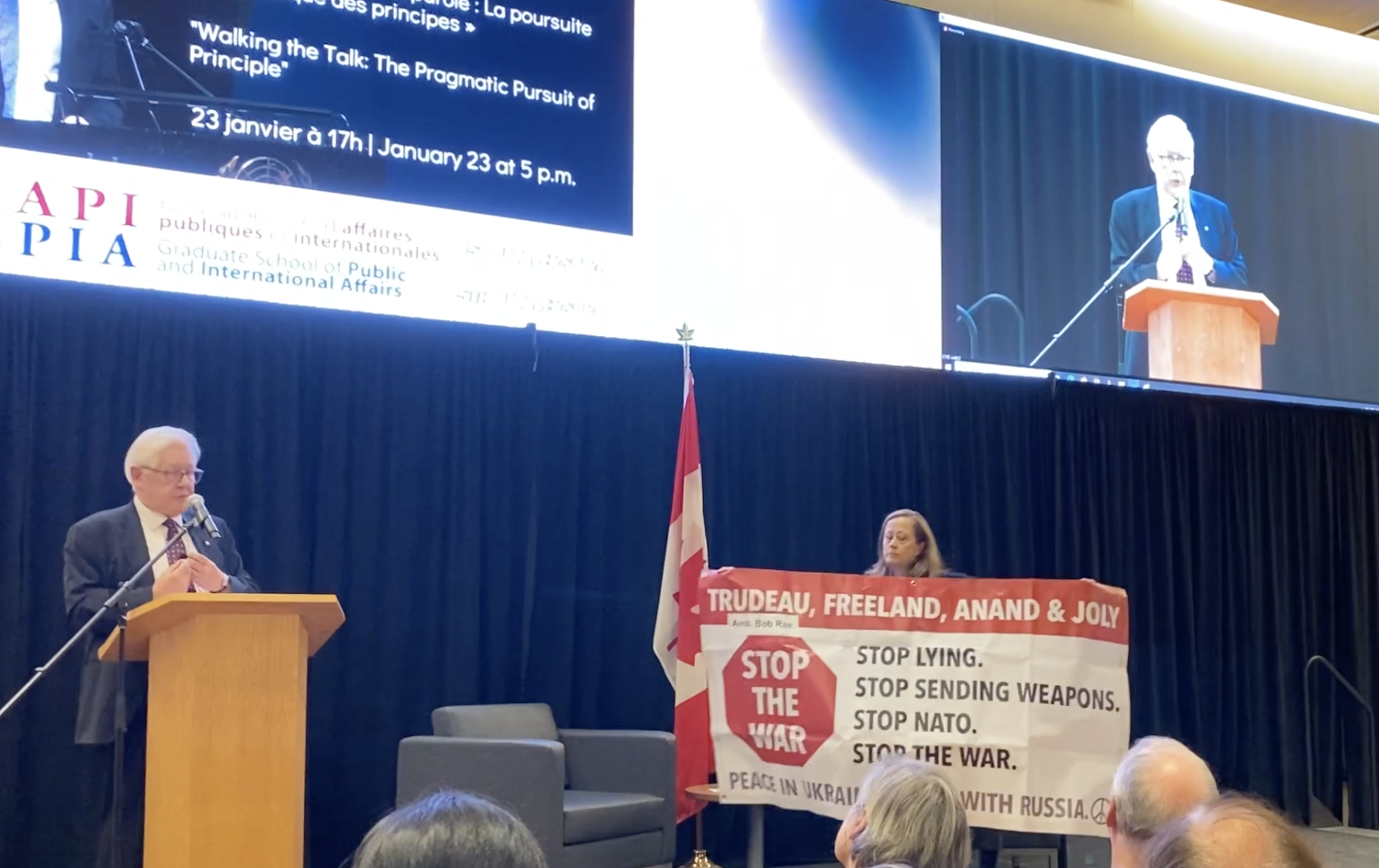 The talk was interrupted by several peace activists who, while bringing attention to different international policy issues, condemned the ambassador for calling Canada’s foreign policy “principled.”