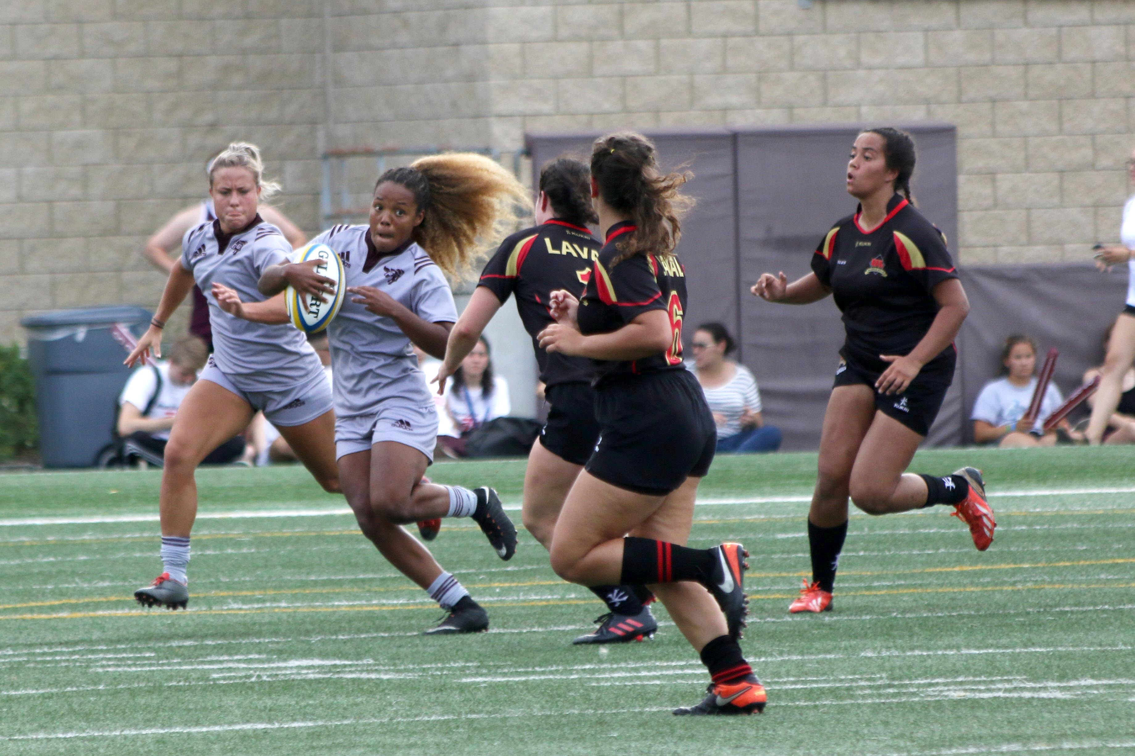 Tori Wyman scored the first try of the match, followed by first-year Michaela Haley, putting the Gee-Gees up by 14 early in the game.
