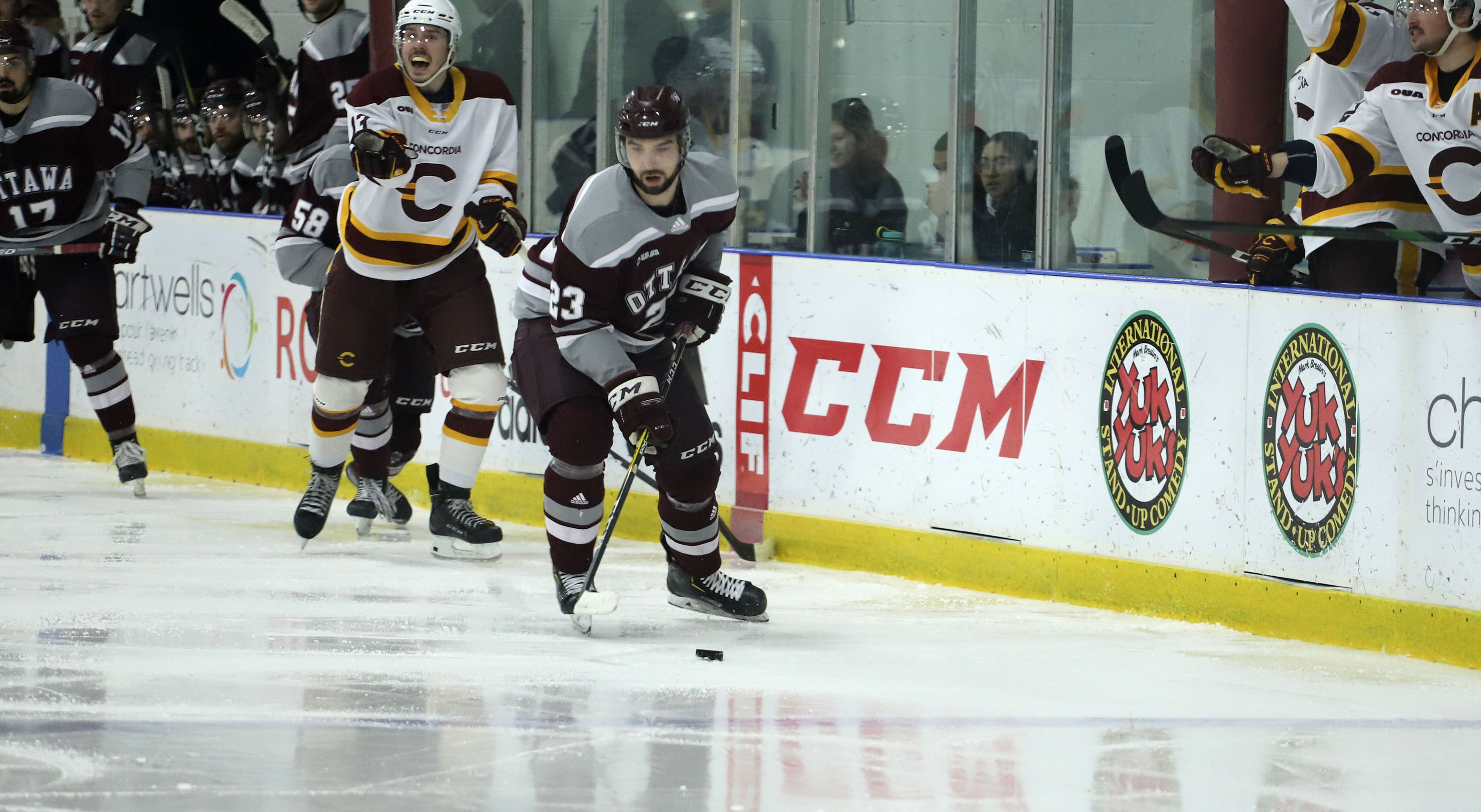Ottawa responded less than two minutes later when Yvan Mongo dangled around a Concordia defenceman and slid the puck past the outstretched Concordia netminder for a beautiful goal, with an assist from Mike Poirer. The game was tied at 1-1.